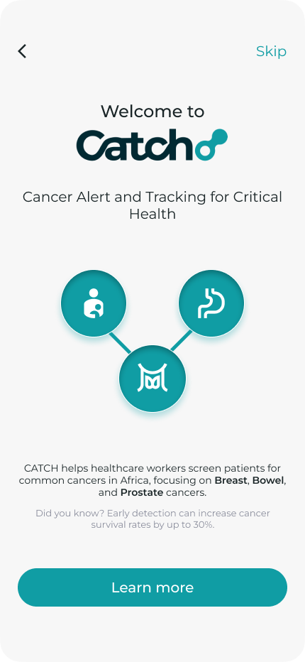 Our customizable digital health app, CATCH offers personalized cancer screening in Africa, simplifying the process and enabling early detection in remote areas.
